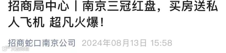 据报道,上述“买房送飞机”的楼盘位于南京市玄武区北苑东路与大壮观路交汇处,项目名为“招商局中心·臻境”,开发商为南京玄盛房地产开发有限公司。“‘买房送飞机’于8月初开始,到本月底结束,属于正常营销活动。”