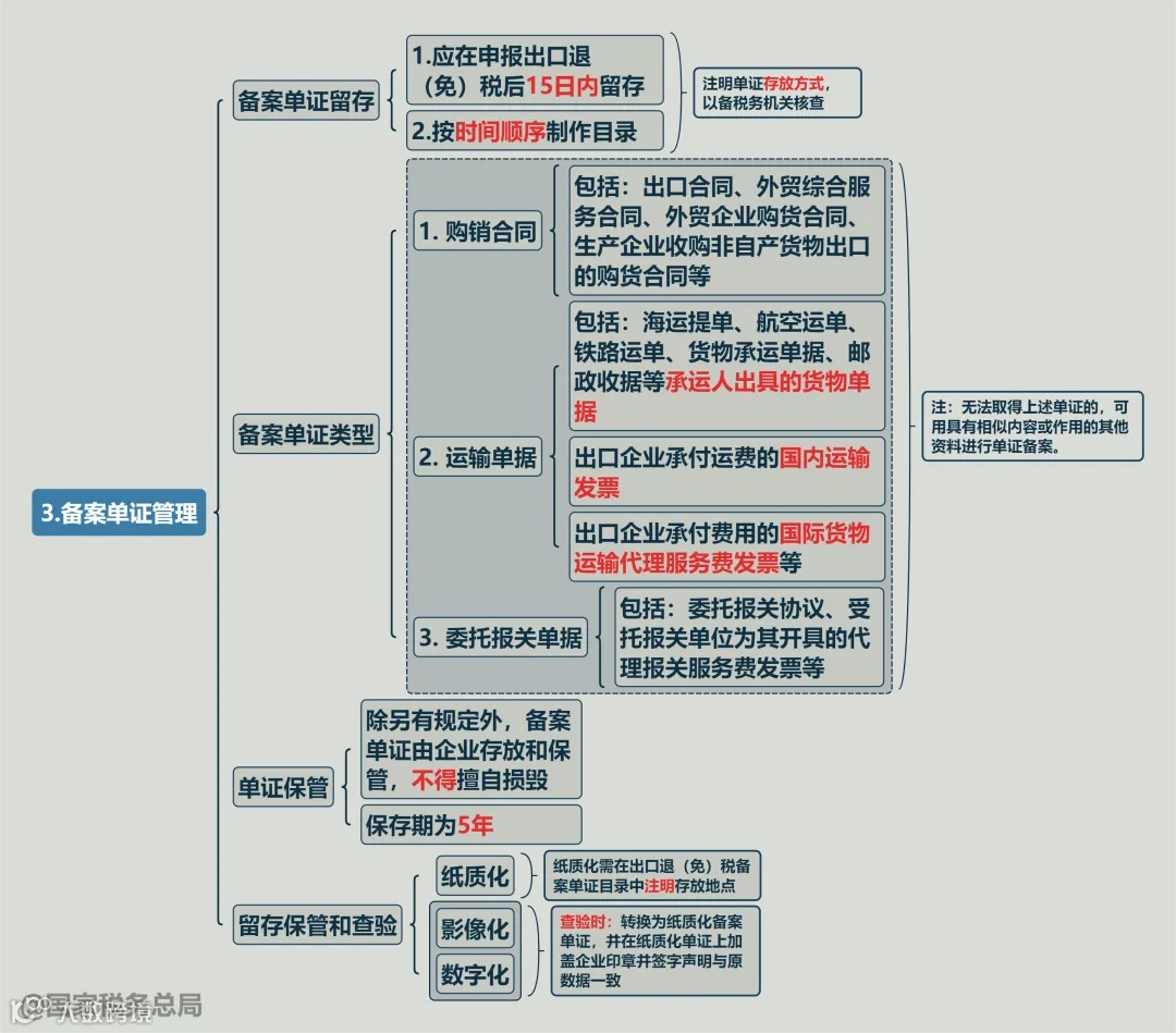 为帮助企业深入准确理解出口退(免)税政策规定,熟练掌握出口退(免)税业务办理操作流程,更好地适应行业发展新形势,国家税务总局近日发布《跨境电商出口海外仓出口退(免)税操作指引》,旨在为跨境电商出口海外仓企业提供详实办税指导。我们将指引内容梳理为思维导图,今日发布:跨境电商出口海外仓出口退(免)税操作指引——出口退(免)税备案单证管理。