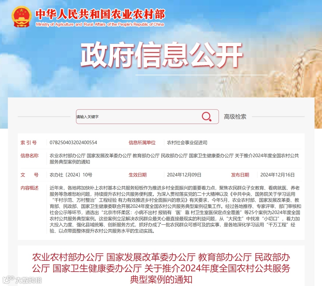 近日,农业农村部办公厅、国家发展改革委办公厅、教育部办公厅、民政部办公厅、国家卫生健康委办公厅联合发布关于推介2024年度全国农村公共服务典型案例的通知,经过各地推荐、专家评审、部门审核和社会公示等环节,遴选出25个案例为2024年度全国农村公共服务典型案例。其中,黑龙江省齐齐哈尔市甘南县1个案例入选。