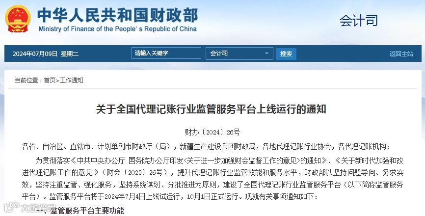 7月3日,财政部发布《关于全国代理记账行业监管服务平台上线运行的通知 》。