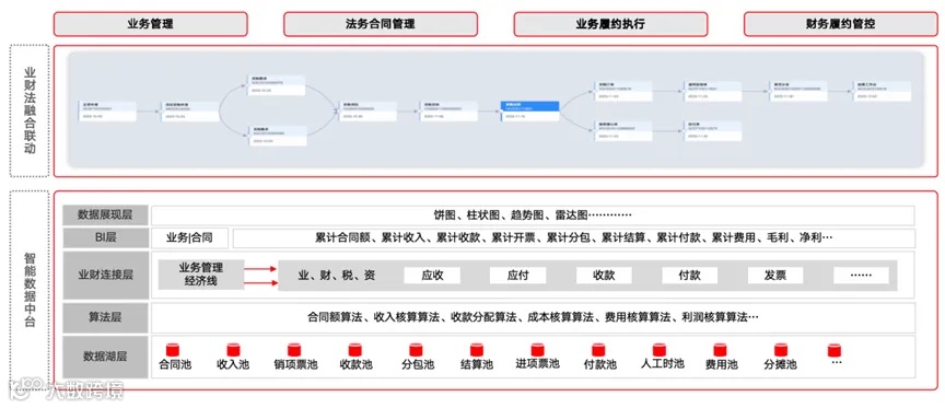 “数智合同”在合同履约阶段为企业提供履约智能引擎,首先完成企业的业务、财务、法务的一体化闭环,在整个履约过程中,通过智能化能力将合同条款结构化为业务控制规则,从而控制业务的履约,真正做到事前防控。并且通过智能引擎,提前将业务可发生的风险发送给相关人员,做到真正的履约防控。