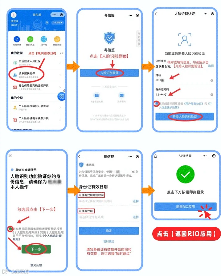 微信进入“粤税通”小程序,进入【城乡居民社保】,跳转“粤信签”小程序按提示完成【人脸识别登录】,点击【返回RIO应用】。