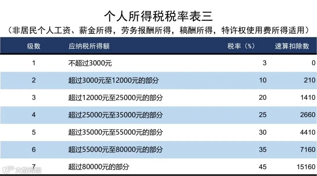 4、非居民个人工资、薪金所得;劳务报酬所得;稿酬所得;特许权使用费所得税率表