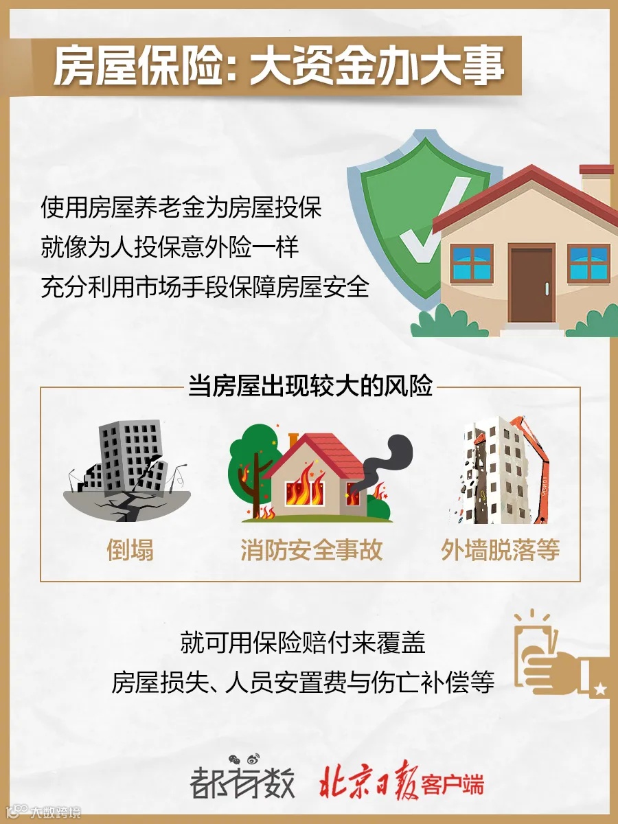 至于房屋养老金的用途,住建部表示,房屋养老金个人账户和公共账户资金将共同保障房屋全生命周期的安全。其中,个人账户资金按照住宅专项维修资金管理规定,专项用于住宅共用部位、共用设施设备保修期满后的维修和更新、改造。公共账户资金则主要用于房屋体检和保险等支出。