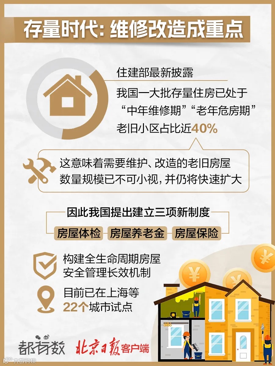 8月23日,在国新办举行的“推动高质量发展”系列主题新闻发布会上,住建部表示,研究建立房屋体检、房屋养老金、房屋保险制度,构建全生命周期房屋安全管理长效机制。目前,上海等22个城市正在试点。