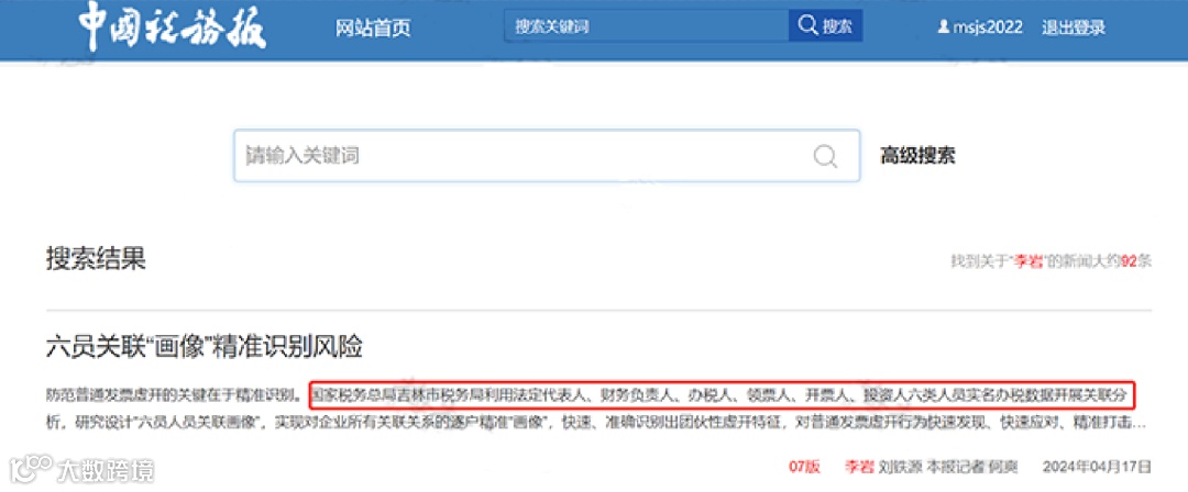国家税务总局吉林市税务局利用法定代表人、财务负责人、办税人、领票人、开票人、投资人六类人员实名办税数据开展关联分析,研究设计“六员人员关联画像”,实现对企业所有关联关系的逐户精准“画像”,快速、准确识别出团伙性虚开特征,对普通发票虚开行为快速发现、快速应对、精准打击。