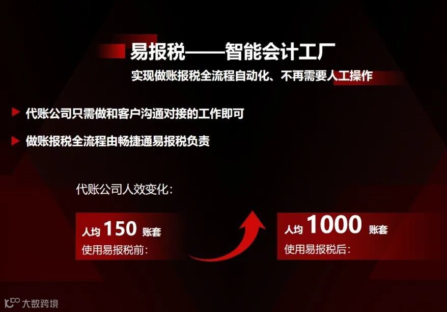 易报税产品实现了做账报税全流程自动化,无需人工操作,代账公司只需负责与客户沟通对接,做账报税则由畅捷通易报税完成。这种智能会计工厂模式大幅提高人效,使用前代账公司会计人均150账套,使用后可达1000账套。