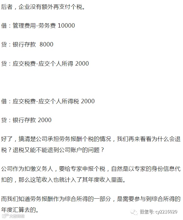 公司承担了劳务报酬的个税,汇算能不能直接退给公司?