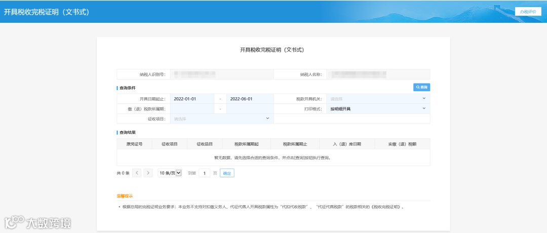 (2)表格式完税证明可通过电子税务局【我要办税】—【证明开具】—【开具税收完税证明(表格式)】查询开具,表格式完税证明仅能开具一次,如需再次打印,可通过电子税务局【我要办税】—【证明开具】—【开具税收完税证明(表格式)补打】模块操作。