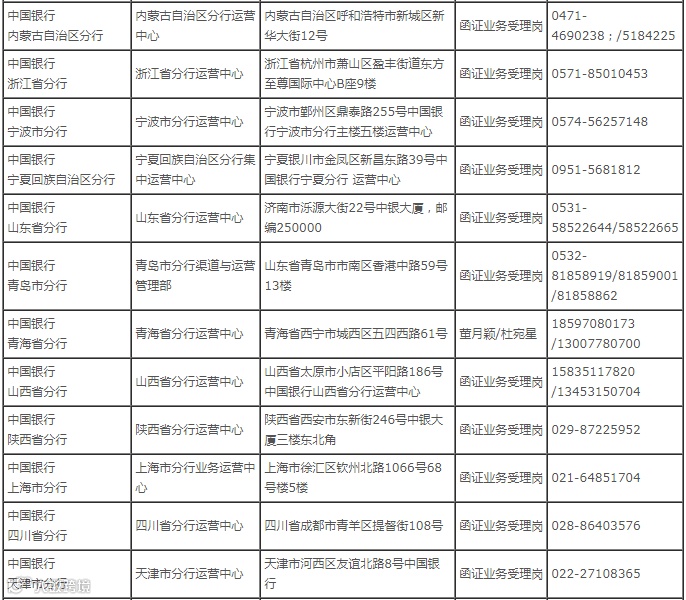 注:受疫情影响,北京、内蒙古、黑龙江、上海、湖南、广东、广西、四川、宁夏、西藏、大连、青岛、宁波、苏州分行可受理纸质函证集中处理服务,其他分行暂无法办理集中回函,营业时间将另行更新公告。发函前请电话咨询当地分行,具体业务办理标准、营业时间以分行规定为准。