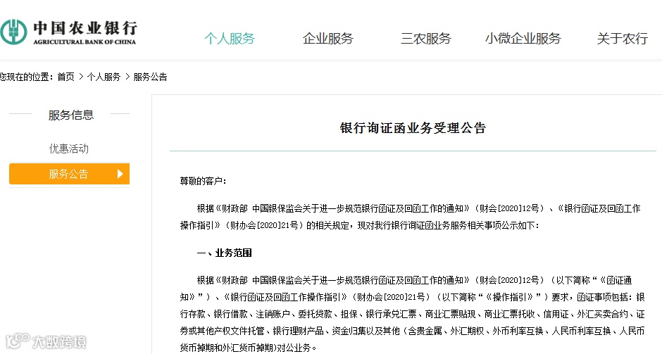 根据《财政部 中国银保监会关于进一步规范银行函证及回函工作的通知》(财会[2020]12号)、《银行函证及回函工作操作指引》(财办会[2020]21号)的相关规定,现对我行银行询证函业务服务相关事项公示如下: