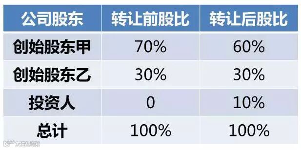 如果是创始股东转让公司股权,那就会有所不同,例如:上述例子中大股东转让10%的股权给投资人,价格仍然是100万,那么公司的股权结构就变成了60%,30%和10%。如下图: