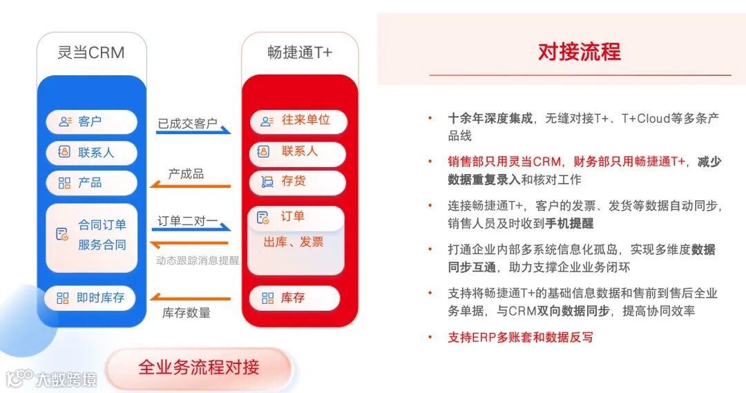 与畅捷通结伴同行,双方产品的深度集成,令数智化的齿轮得以加速转动。灵当CRM与畅捷通T+、T+Cloud等多条产品线无缝衔接,实现多维度数据同步互通,基础信息数据和售前到售后的全业务单据,与CRM双向数据同步,令销售过程管控规范化,从而实现了企业业务闭环。