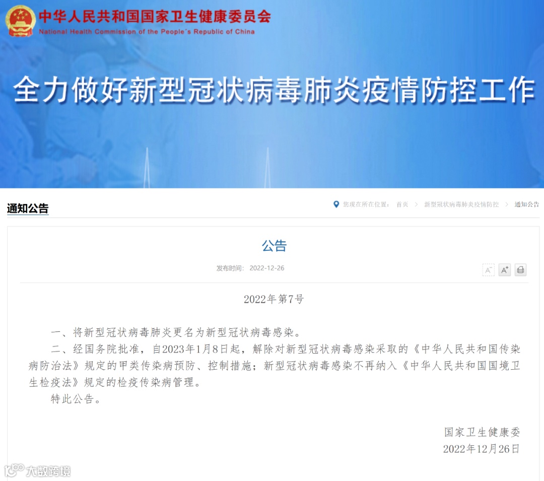 根据国家卫健委2022年12月26日、27日消息,自2023年1月8日起,解除对新型冠状病毒感染采取的《中华人民共和国传染病防治法》规定的甲类传染病预防、控制措施。