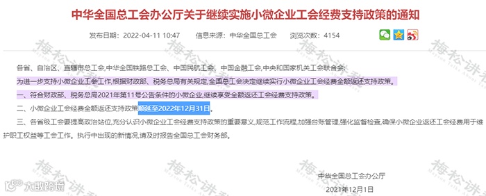 1.小微企业2022年全额返还工会经费支持政策顺延至2022年12月31日。 也就是说,2022年1月1日至2022年12月31日的工会经费,实行全额返还支持政策!