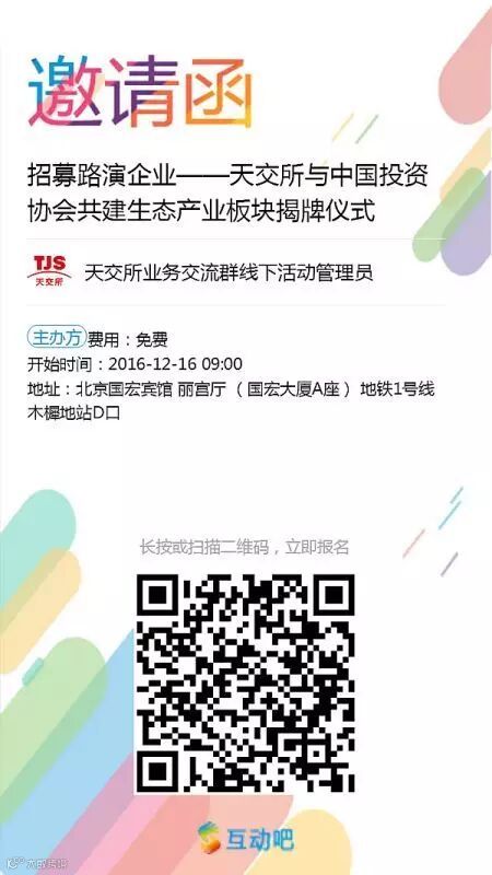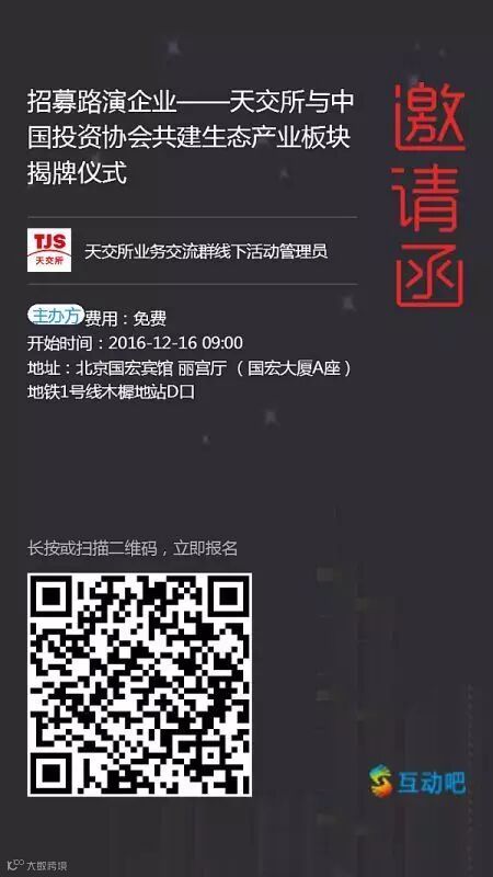 在2016中国生态文明建设与产业投资高峰论坛暨第二届国际生态产业投融资对接会上将隆重举行天交所生态产业板揭牌仪式和首批生态企业板企业挂牌仪式。会上还将有6-8家企业有机会与高层政府领导、高端投资者、投资机构负责人、专业学者见面进行路演对接,现正招募路演企业,机会难得,欢迎天交所挂牌企业与意向企业报名。注意事项:有意向的企业请事先提交PPT初审。