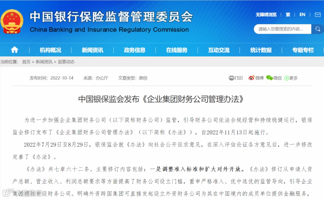 10月14日,中国银保监会修订发布了《企业集团财务公司管理办法》,以进一步加强企业集团财务公司监管,引导财务公司依法合规经营和持续稳健运行。新规自2022年11月13日起施行。