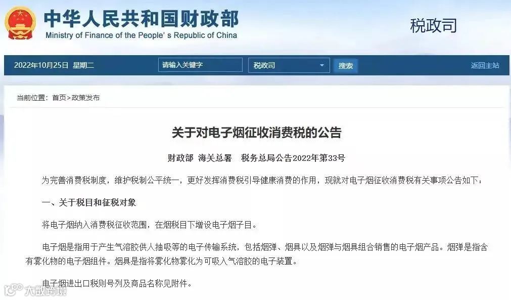 财政部、海关总署、税务总局发布《关于对电子烟征收消费税的公告》,将电子烟纳入消费税征收范围,在烟税目下增设电子烟子目,将于2022年11月1日起执行。