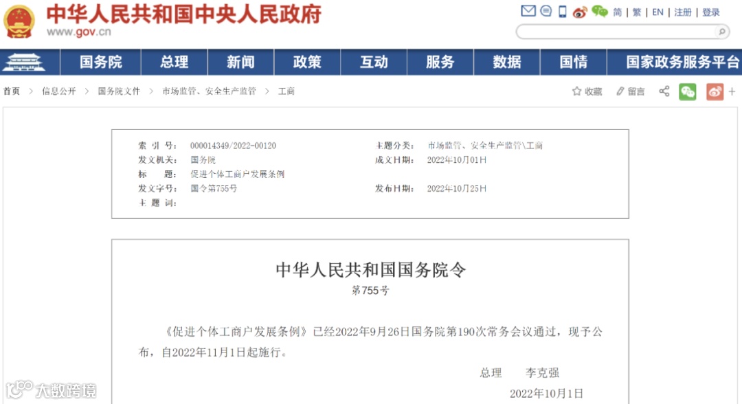 10月25日国务院发布《促进个体工商户发展条例》,自2022年11月1日起施行。
