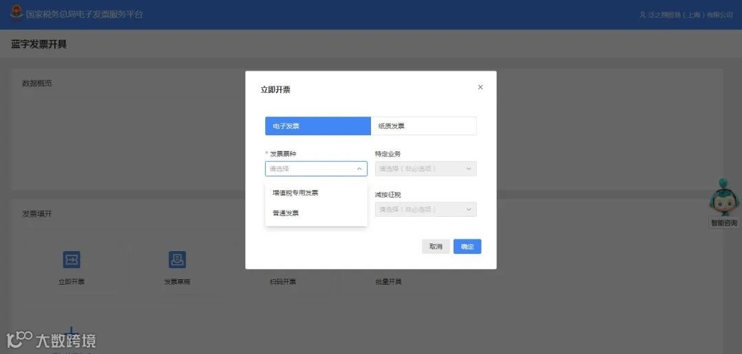 第四步:选择要开具发票的票种(电子发票/纸质发票),如您有差额征税等情况,请据实选择。设置后,点击【确定】。