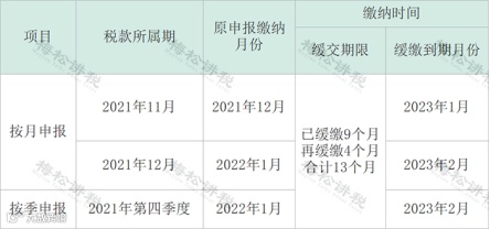 (1)延缓缴纳2021年第四季度部分税费的,在延长9个月的基础上继续延长4个月,合计延长13个月
