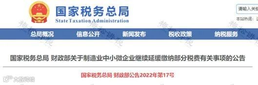 国家税务总局 财政部发布2022年第17号公告,宣布自2022年9月1日起,已享受延缓缴纳税50%的制造业中型企业和延缓缴纳税费100%的制造业小微企业,其已缓缴税费的缓缴期限届满后继续延长4个月。