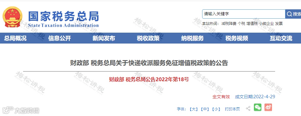 1.自2022年5月1日至2022年12月31日,对纳税人为居民提供必需生活物资快递收派服务取得的收入,免征增值税。