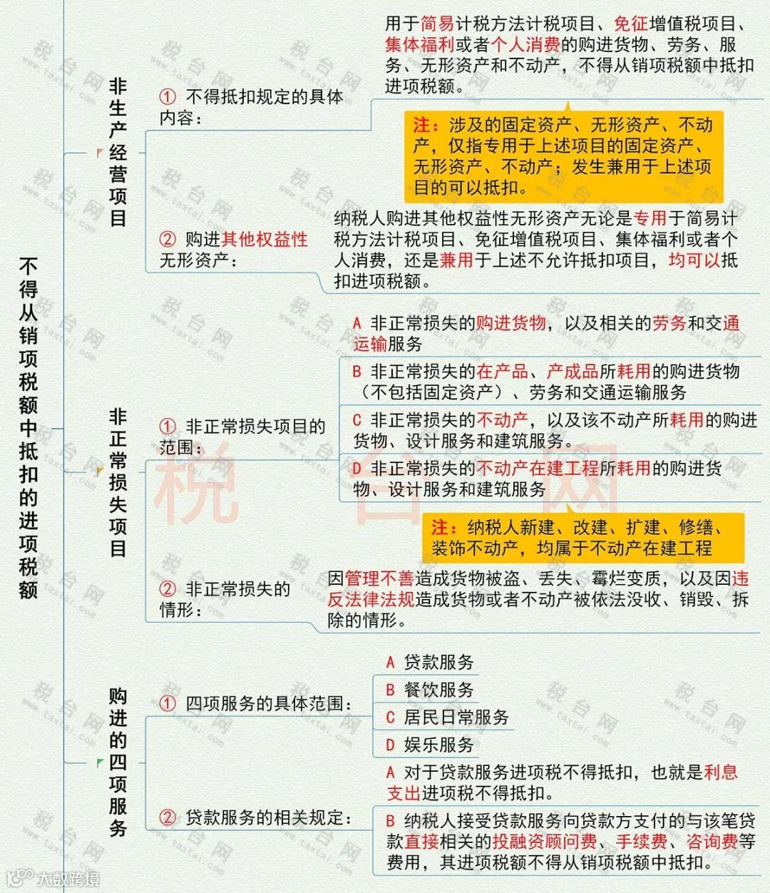 不能抵扣进项税的所有情形下图全部涵盖了,一起学习一下吧。