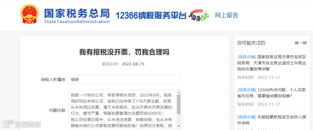 我是一个培训公司,有取得相关资质,2022年8月,税务局的同志来我公司,说我已经申报了158万营业额,但是从未申领过发票,属于未按规定,应当开具未开具发票的行为,情节严重,根据发票管理办法要罚我5000元!