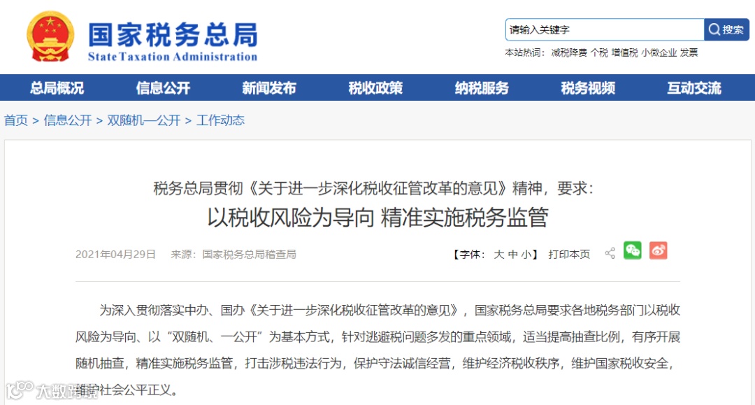 一是“被抽查”。我们每一个企业的名字在税务稽查的系统里有一个“数据库”。在有税务稽查任务的时候,就会从数据库里进行抽,形式类似摇号,抽奖。