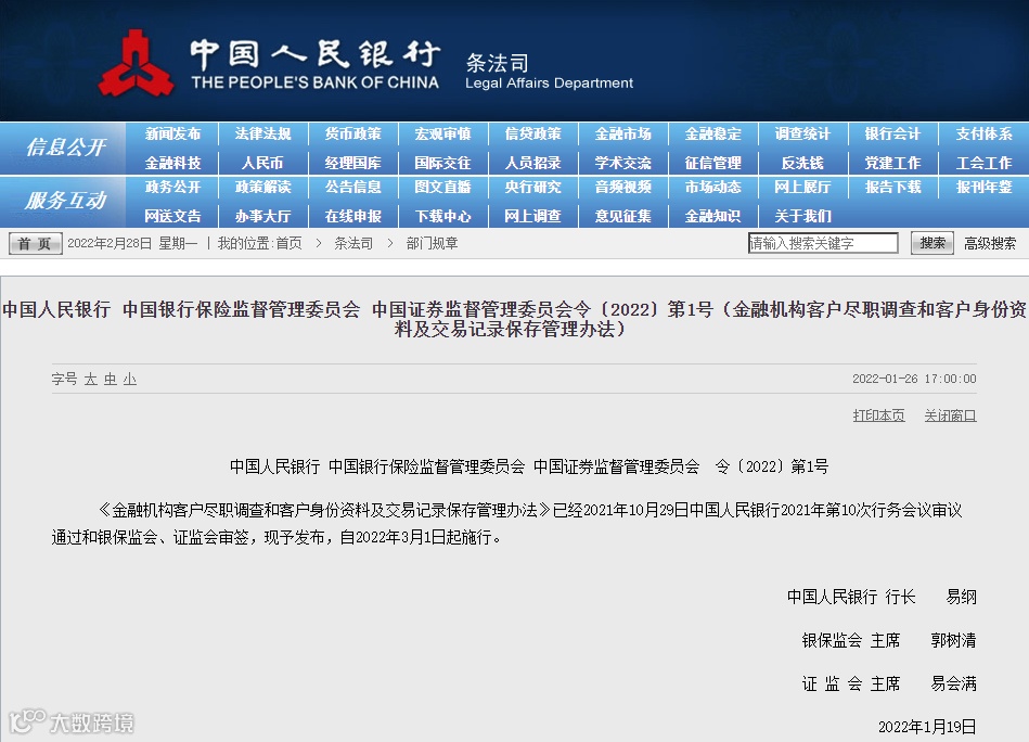 央行发布的《金融机构客户尽职调查和客户身份资料及交易记录保存管理办法》: