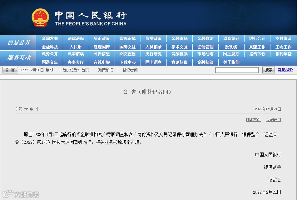 2月21日,央行发布最新公告:原定2022年3月1日起施行的“个人存取现金超过5万以上需要登记资金来源或用途”因技术原因暂缓施行。