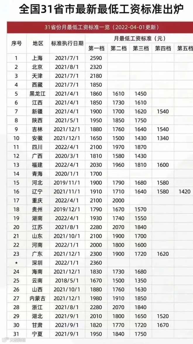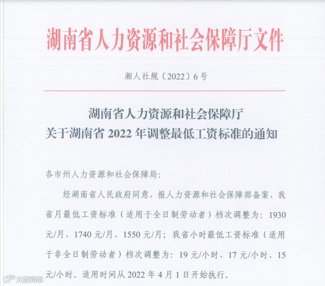 3月22日,湖南省人力资源和社会保障厅发布的《关于湖南省2022年调整最低工资标准的通知》明确:4月1日起,湖南省月最低工资标准档次调整为:1930元/月、1740元/月、1550元/月。