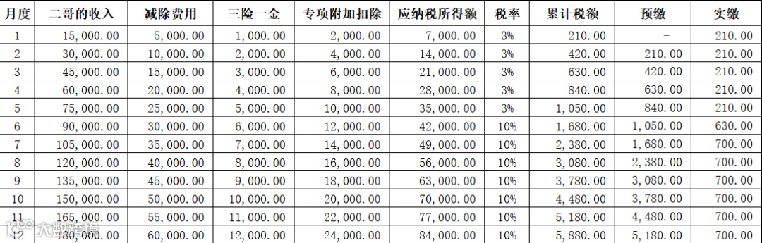 =(15000*10-5000*10-1000*10-2000*10)*10%-2520-3780=700元