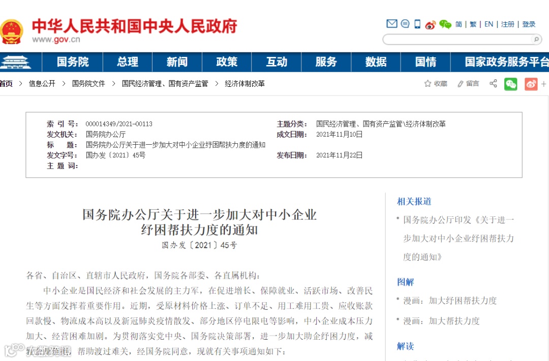 11月22日,国务院办公厅公开了《关于进一步加大对中小企业纾困帮扶力度的通知》(国办发〔2021〕45号)。