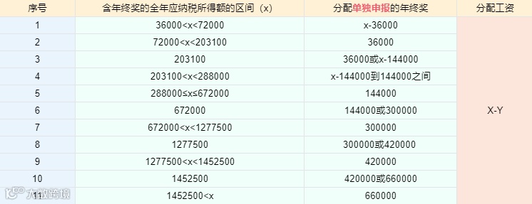 当含年终奖的全年应纳税所得额大于36000时,由于年终奖单独申报存在雷区等原因,为使税负最低,可在年终奖和工资之间进行分配,分配的年终奖按照全年一次性奖金单独申报。