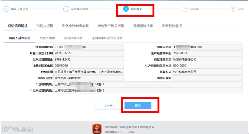 系统展示纳税人提交的基本信息以及涉税信息供纳税人预览,若填写有误可返回上一步进行修改,若确认无误,可点击“提交”完成新办企业登记申请操作。企业可下载查看《新办企业涉税事项申请表》,确认填报的内容。