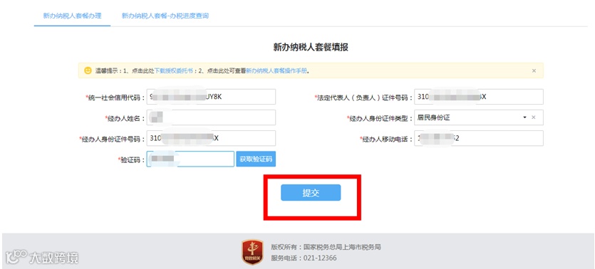 新办纳税人套餐填报需输入新办企业“统一社会信用代码”、“法定代表人身份证号码”和“经办人信息”。