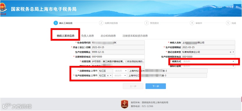 纳税人基本信息页签需填写纳税人所处街乡信息、联系电话、核算方式。