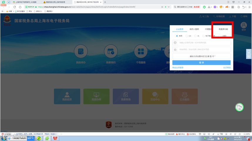 在上海市电子税务局首页右上角点击“登录”——“免登录功能”,选择“新办纳税人套餐”链接进入操作界面。