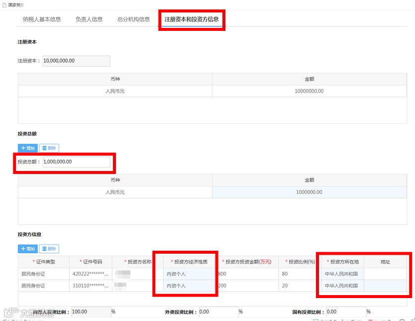 注册资本和投资方信息页签需维护投资人的经济性质、投资方所在地,对于中国国籍的投资人还需要填写其住所地址。