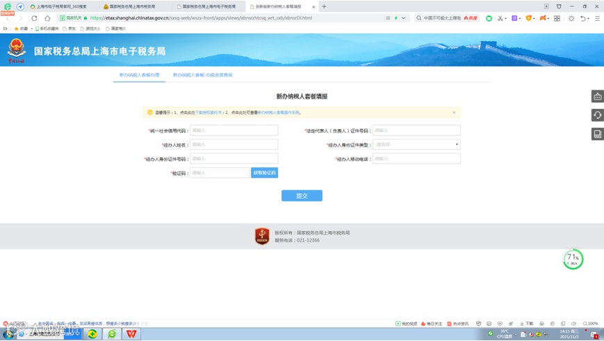 点击“提交”按钮,系统将自动抽取市监等部门登记信息。实行“多证合一”登记制度改革后,在新办企业注册登记环节,市监等部门将把登记信息共享至税务部门。如果尚未完成注册登记或市监等部门尚未将相关登记信息共享至税务部门,系统将弹出提示信息,纳税人需前往市监等部门核实有关情况。