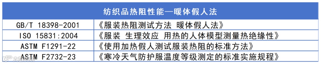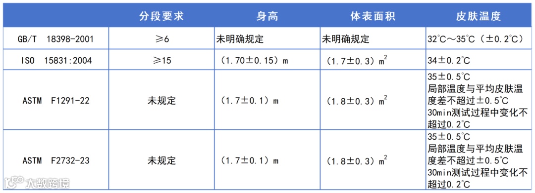 GB/T 18398-2001、ISO 15831:2004、ASTM F1291-22、ASTM F2732-23对暖体假人的规格都做了相关规定,区别如下: