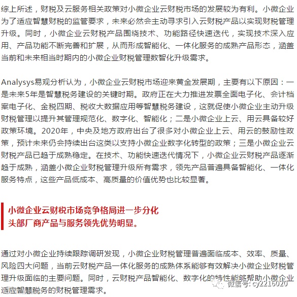随着智慧税务建设、税务大数据共享应用,将进一步倒逼企业,尤其是占据市场主体绝大多数的小微企业财税管理走向规范化、数字化、智能化。云财税以其低成本、高效、高质量的特点成为小微企业财税管理升级最有效工具,因此预计小微企业云财税服务需求将被快速激活。
