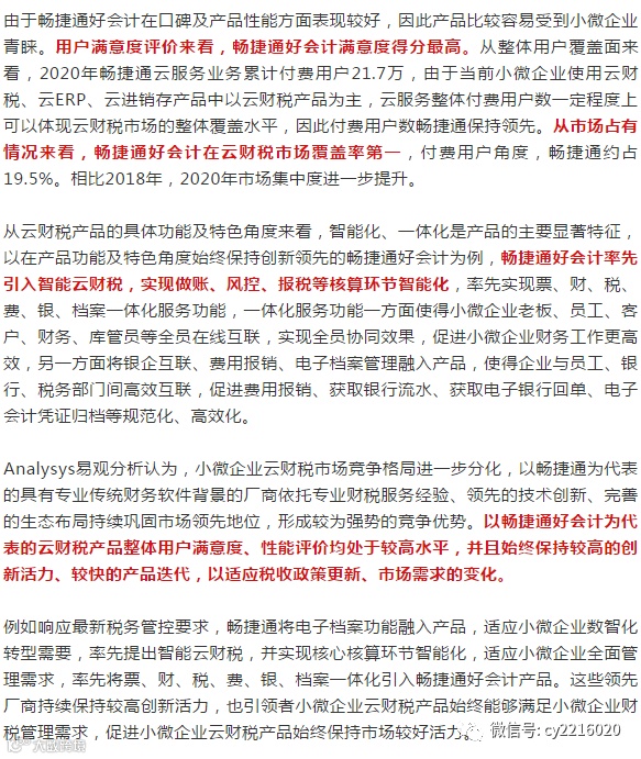 2021年开始,随着发票全面电子化、金税四期工程、税收大数据云平台完善等一系列智慧税务建设的推进,对小微企业财税管理数字化、规范化要求将逐渐提升,小微企业云财税市场迎来较好的黄金发展期。需求面,小微企业财税管理数字化趋势促进小微企业云财税需求快速增加;供给面,云财税产品和服务不断优化,高度贴合小微企业现实需求,帮助小微企业顺利实现转型。预计未来小微企业云财税产品及服务的领先性将成为云财税厂商取得竞争优势的关键。与此同时,开放化、平台化的生态构建也将持续巩固厂商竞争壁垒。