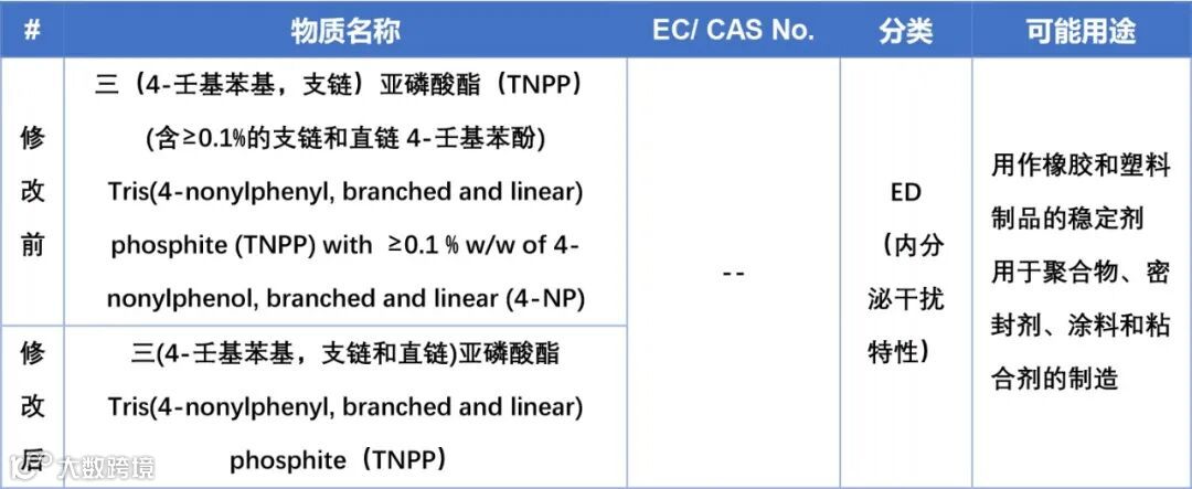 其中本次第32批清单咨询中的“三(4-壬基苯基,支链和直链)亚磷酸酯”被认定为该类物质本身及含有≥ 0.1%的4-壬基苯酚(支链和直链)时均具有对环境的内分泌干扰特性,而该物质已被列入2019年7月发布的第21批SVHC候选物质清单中,因此,本次公告将2019年7月公布第21批的物质名称修订为“三(4-壬基苯基,支链和直链)亚磷酸酯”,不再重复列入第32批SVHC候选物质清单。
