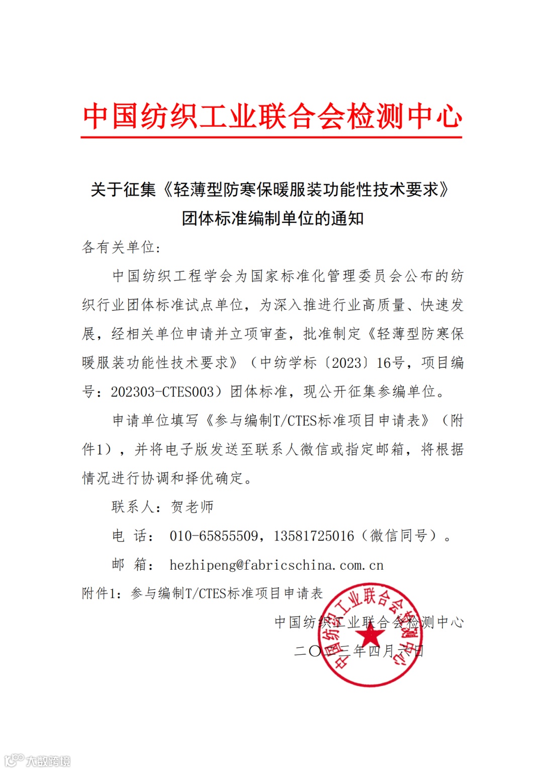 中国纺织工程学会为国家标准化管理委员会公布的纺织行业团体标准试点单位,为深入推进行业高质量、快速发展,经相关单位申请并立项审查,批准制定《轻薄型防寒保暖服装功能性技术要求》(中纺学标〔2023〕16号,项目编号:202303-CTES003)团体标准,现公开征集参编单位。
