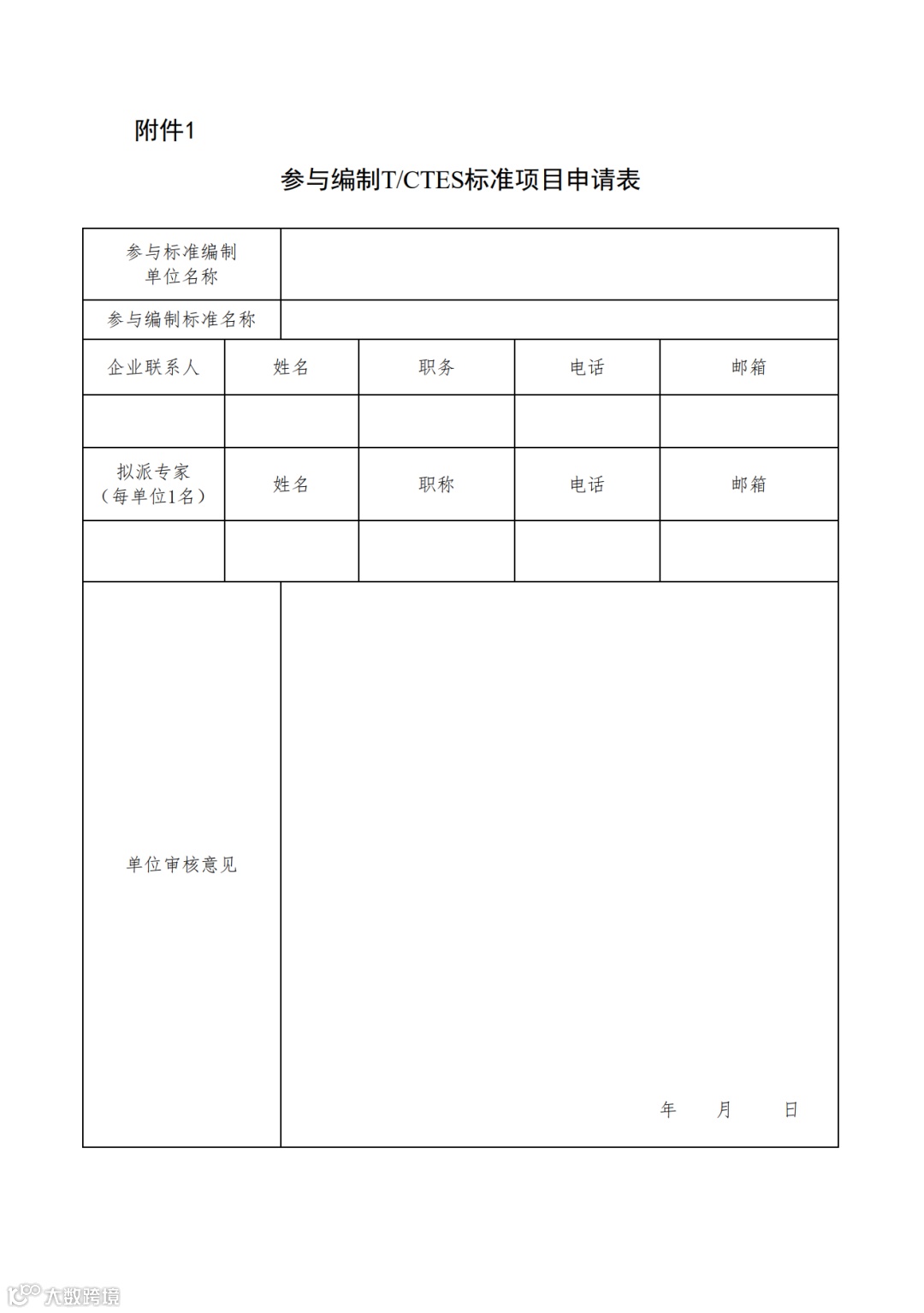 申请单位填写《参与编制T/CTES标准项目申请表》(附件1),并将电子版发送至联系人微信或指定邮箱,将根据情况进行协调和择优确定。
