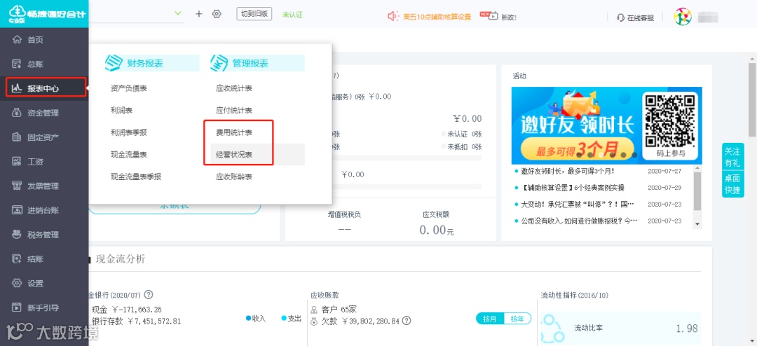 畅捷通好会计系统内的数据报表(如:资产类科目余额有无赤字、报表是否平衡、凭证断号、往来欠款、费用情况等)能为公司自动检查账目异常、出具现金流量表,降低企业账务风险。