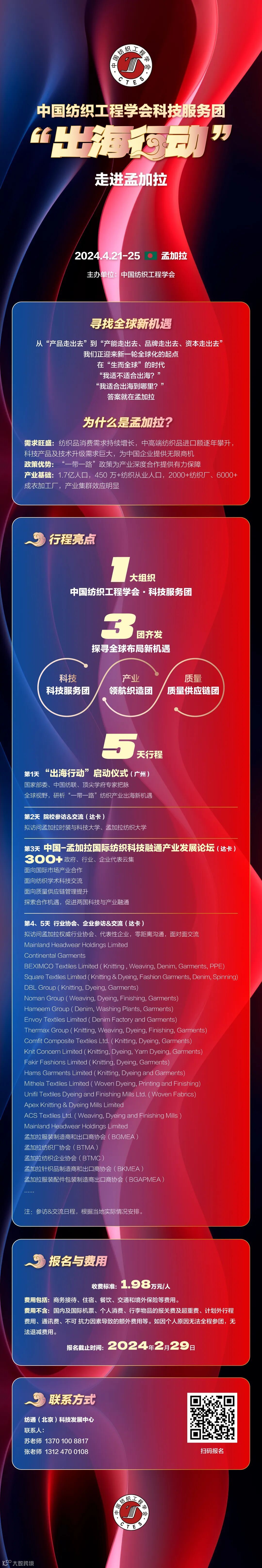 作为2024年,中国纺织工程学会组织的首场出海中,主办方将集结来自中国纺织服装供应链企业、科研机构及院校优秀代表组成的“科技服务团、领航织造团、质量供应链团”,三团齐发,以“科技、产业、质量”推动行业融通发展。